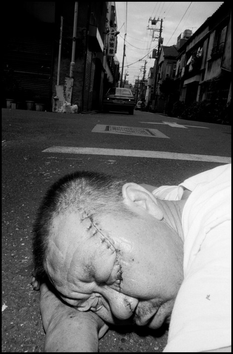 Bruce Gildn有几个标签化的东西,如他是黑帮子弟,擅长拍摄黑帮等。这些标签宣传者 可以上UC编辑部报道了。其实在《GO》这部描述日本阴暗灰色二十世纪末的画册中,对于日 本黑帮雅库扎的展示只占其中一部份,并且是Gilden事先沟通好后才拍摄的。剩余部份还有 无神的上班族,迷茫的少年暴走族,处境可怜的无家可归者,满面悲苦的易装癖等。我认为 Gilden这部作品,是他的职业生涯中最接近老式传统纪实,且最容易看懂的。