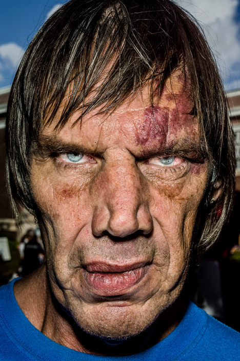 用容易产生畸变的广角镜头,配合后期的高锐度、高饱和、高对比 的三高HDR风格,来凸显并夸张人物脸部。这些史无前例的丑陋大头照纠枉过正地批判了大 众对于美人脸的想象和欣赏。每张脸庞都是并不完全对称,且充斥着各种缺陷的。并且这些 人脸又展示出其主人所经历的沧桑和磨难。他们是斗士,与生活抗争并留下荣耀。完全脱离 事件要素,任由观赏者去想象和推断。摄影,未必是为了展示狭义的美(其实这里我更愿意 用“漂亮”这个词),作为街头、纪实摄影师来说尤其如此…… 如果排个不负责任的谱系的话,Bruce Gilden这部作品里较明显的受Weege, Lisette Model, Diane Arbus, Martin Parr影响。特别是这部作品里的三高效果感觉继承发展自 Parr的《Real Food》项目。嗯,不负责任的猜想 ^__^